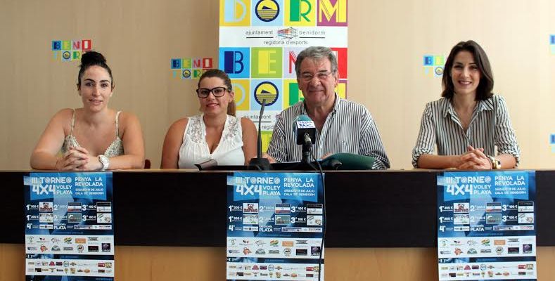 El concejal de Deportes, Miguel Llorca, ha presentado esta mañana el III torneo 4×4 de Voley Playa de la Penya La Revolada, que se disputará el próximo sábado 19 de julio en la playa de La Cala de Benidorm. Las peñistas Patricia Santiago, Raquel Lorente y Andrea López han acompañado al edil en la comparecencia ante los medios y han agradecido “el apoyo que todos los años nos brinda la el Ayuntamiento ayudándonos a organizar este torneo en la playa”.