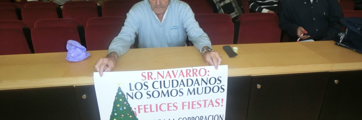 Esta vez no hace uso de la palabra. Trae un cartel en que dice :»…¡FELICES FIESTAS! , a toda la corporación, MENOS A DOS PERSONAS», en un principio, un Policía se lo retira pero, todo se debe decir, es el alcalde quien le dice al agente que se lo devuelva, cosa que se hace y aquí paz y allá gloria. Yo le pregunta los nombres de esas dos personas y me dijo,textualemnte, «Romeo y Julieta».Pero el alcalde no contesta a las preguntas del contribuyente. La incognita se mantiene sobre los nombres de las dos personas que mandan. Todos sabemos que hay solo una,GEMA AMOR, ¿quien es la otra?.
