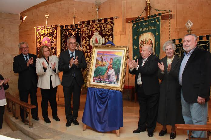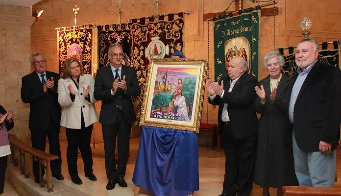 El alcalde de Benidorm, Agustín Navarro, la edil de Fiestas, Cristina Escoda, y numerosos concejales de la corporación municipal de Benidorm han acudido esta tarde a la presentación del cartel de la Semana Santa 2015, obra del pintor local Miguel Ribes Sogorb. La presentación se ha celebrado a las ocho y media en la parroquia de San Juan Bautista de La Cala, donde radica la ‘Cofradía de Jesús en el Huerto de los Olivos’, que organiza los actos de este año.