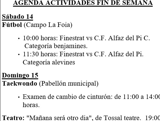 FINESTRAT.- AGENDA FIN DE SEMANA