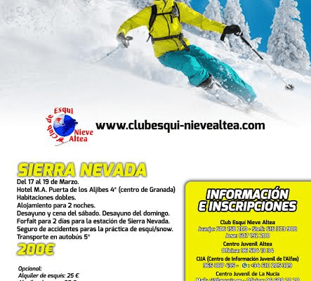El viaje a la estación de ski Sierra Nevada es el único con plazas libres, todavía. Del 17 al 19 de marzo será el viaje a la estación de esquí granadina de Sierra Nevada. Este viaje tiene un precio de 200€ e incluye alojamiento en Hotel M.A. Puerta de los Aljibes de 4 estrellas (centro de Granada), desayuno y cena sábado y desayuno domingo, forfait para 2 días en Sierra Nevada, seguro y transporte.