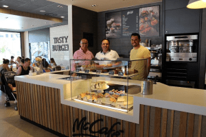 El alcalde de Finestrat, Juan Francisco Pérez, junto al concejal de Modernización y Redes Sociales, David Alarcón, ha visitado este medio día el nuevo restaurante Mc Donald’s Finestrat.