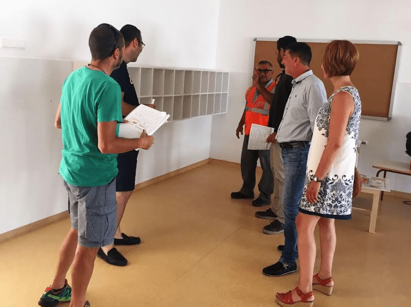 La concejala de Educación, Mª Dolores Viudes, y el edil de Obras y Servicios técnicos, Tomás Sellés, visitaron el colegio junto al director, José Vicente Galán y los técnicos municipales de estas concejalías. El motivo de la visita fue hacer seguimiento de las actuaciones que se está realizando desde el consistorio para adecuar las instalaciones a este nuevo servicio educativo. “Estamos habilitando 2 aulas físicas para acoger a los 18 alumnos de 2 años. Un aula será para uso exclusivo pedagógico y la otra para diversos recursos como zona de descanso. Además, vamos a acotar el patio que usarán porque, debido a su temprana edad, estos alumnos están separados de los demás escolares de Educación Infantil. También estamos ejecutando varias actuaciones en materia de seguridad como cambiar estanterías o instalar retenedores para evitar que se cierren las puertas”. Otra medida emprendida desde el consistorio ha sido habilitar una bañera con sus correspondientes accesorios para garantizar la higiene de los menores en caso de que fuera necesario. En el patio, contarán con unos 100m2 de superficie para jugar y zonas de sombra con toldos.