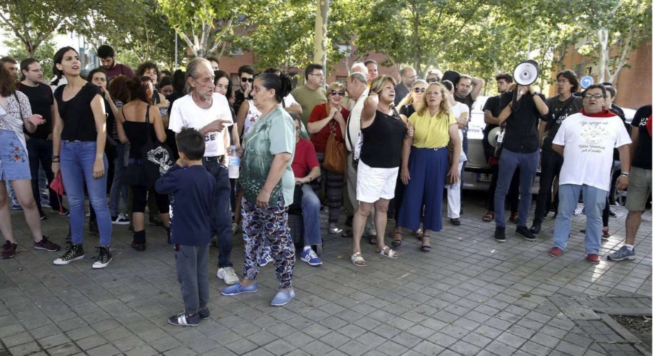 La Unión Estatal de Músicos y Actores convocó una concentración a las siete de la tarde en la puerta principal de la Caja Mágica en memoria de Pedro Aunión Monroy (Madrid, 1975), especialista en danza aérea, coreógrafo y bailarín, fallecido anteayer tras caer desde una altura de 30 metros durante su actuación en la segunda edición del festival Mad Cool.