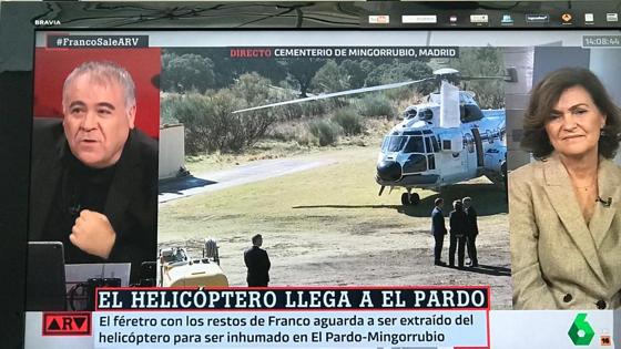 14.12La vicepresidenta del Gobierno, Carmen Calvo, tertuliana en directo en La Sexta, comentando la llegada del helicóptero a Mingorrubio. Calvo había dicho en su día que la exhumación no se convertiría «en un circo» y que no habría medios presentes.