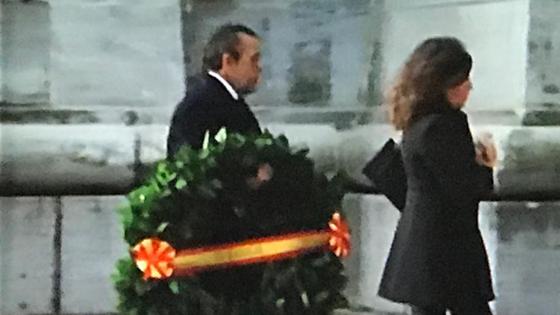 14.40«La familia llegó al Valle con una bandera preconstitucional. No se les permitió entrar con ella en la Basílica y tuvieron que dejarla a la entrada. Los agentes de la autoridad la colocaron en uno de los coches que trasladaba a la familia. El féretro salió cubierto por un estandarte con la cruz laureada de San Fernando, como enseña familiar, y, sobre él, una corona de laurel con lazos con los colores de la bandera de España», según informa el Gobierno. No obstante, la cruz corresponde al ducado de Franco.