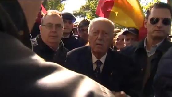 12.50Al fondo, con el pelo blanco y traje negro, el ex teniente coronel golpista, Antonio Tejero. Se ha acercado a la protesta de Mingorrubio y ha sido jaleado por los concentrados. Acto seguido, la Policía ha decidido separarlo de la manifestación para evitar incidentes. Informa Enrique Delgado.
