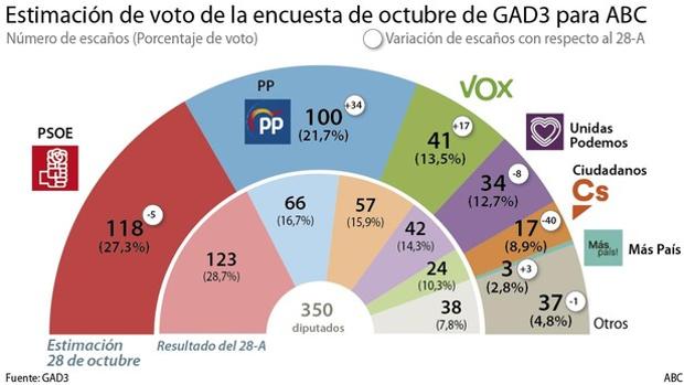 1. El PSOE pierde ocho escaños en solo dos semanas y Vox sube hasta los 41. El PSOE no detiene su caída y sigue perdiendo votos cada semana que pasa. Los disturbios en Cataluña y toda la propaganda relacionada con la exhumación de Franco no solo no está beneficiando a la candidatura de Pedro Sánchez, sino que está haciendo más fuertes a los partidos situados en los extremos, como Vox en el conjunto de España, que consolida su tercera posición, según la última encuesta de ABC/GAD3. En Cataluña, la CUP también sube y aumentaría su representación. Mientras tanto, la lucha por la victoria el 10 de noviembre no está en absoluto cerrada. El PP sigue recortando distancias y ya está a 18 escaños del PSOE, frente a los 57 que separaron a Casado de Sánchez en las elecciones de abril. El trabajo de campo de esta encuesta, de 2.730 entrevistas, se hizo entre el lunes 21 y el jueves 24. Es decir, recoge solo en una pequeña parte la noticia del traslado de los restos de Franco a El Pardo, que fue portada el viernes en todos los periódicos
