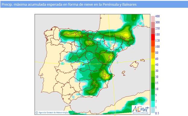 Al mismo tiempo, este día las precipitaciones podrán llegar más hasta el centro de la Península y la cota de nieve subirá pero seguirá baja, en unos 500 a 600 metros en la mitad oriental. De este modo, el portavoz de la AEMET espera nevadas copiosas en el sur de Aragón, este de Castilla-La Mancha, Murcia y Valencia. También aumentará el lunes y el martes la probabilidad de que nieve en Madrid pero, «en caso de producirse» serían nevadas débiles.