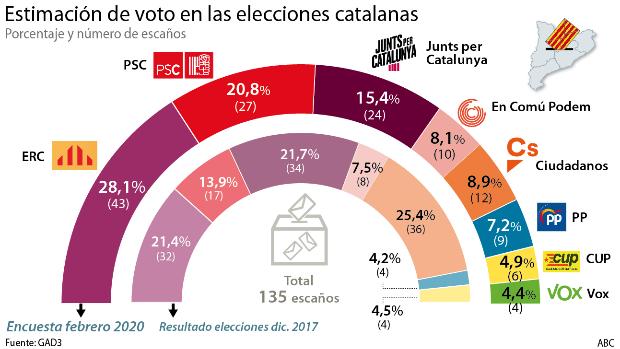 La suma de ambos grupos (67 actas, una más que en la actualidad) se quedaría a un escaño de la mayoría absoluta (68 sobre un total de 135 diputados), con lo que seguiría siendo necesario el concurso de la CUP. El grupo antisistema pasaría de 4 a 6 diputados (ganaría cuatro décimas más de apoyo popular), y seguiría siendo decisivo, igual que en 2017, para decantar la mayoría del Parlamento de Cataluña a favor de las tesis independentistas, que en sufragios obtendría el 48,4% (ahora tiene el 47,6%). El sondeo, hecho a partir de 800 entrevistas entre el 21 y el 26 de febrero, no habría recogido, o al menos no de manera completa, la valoración tras la primera reunión de la mesa de diálogo entre el Gobierno y la Generalitat y, sobre todo, la celebración el pasado sábado del mitin de Carles Puigdemont en Perpiñán (Francia), en lo que de hecho fue el arranque oficioso de la precampaña de las próximas autonómicas y un ataque frontal y directo a la estrategia de colaboración y apoyo de ERC al Gobierno de Pedro Sánchez.