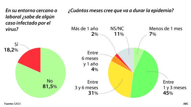 1. Uno de cada cinco madrileños conoce un caso de contagio en su entorno cercano. La crisis del coronavirus ha impactado de forma especial en la Comunidad de Madrid, donde uno de cada cinco ciudadanos asegura que conoce algún caso de infección por el virus en su entorno cercano o laboral. Así se refleja en el barómetro de ABC/GAD3 que se ha realizado esta semana en la región madrileña, entre los días 11 y 12 de marzo. Una amplísima mayoría de los madrileños respaldan las medidas excepcionales que se han tomado, como el cierre de centros educativos o el fomento del teletrabajo. Los entrevistados valoran mejor la actuación del Gobierno autonómico de Madrid que la del Ejecutivo de Pedro Sánchez.