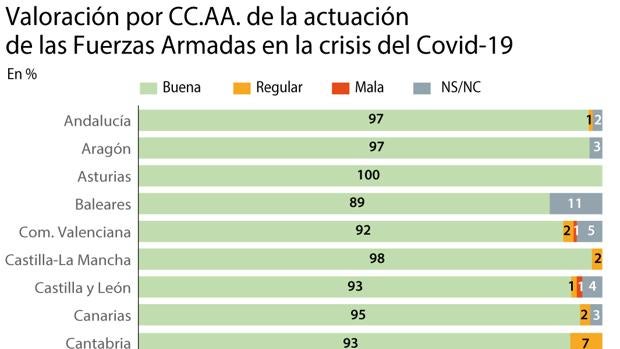 1. Ocho de cada diez catalanes y vascos elogian al Ejército contra el coronavirus. La hostilidad de los políticos nacionalistas hacia las Fuerzas Armadas, incluso en plena lucha contra el coronavirus, poco o nada tiene que ver con el sentimiento de la inmensa mayoría de los ciudadanos de Cataluña y del País Vasco, que aplauden su labor de forma rotunda, según el último barómetro de ABC/GAD3. Lo mismo ocurre con el papel de las Fuerzas y Cuerpos de Seguridad del Estado, que reciben el respaldo de la gran mayoría de los españoles en todas las regiones, incluidos los catalanes y los vascos. Las fuerzas de seguridad y el Ejército son, junto a los profesionales sanitarios, los sectores más aplaudidos por la población en esta crisis del Covid-19, con una valoración mucho más alta que la que reciben los políticos en general.
