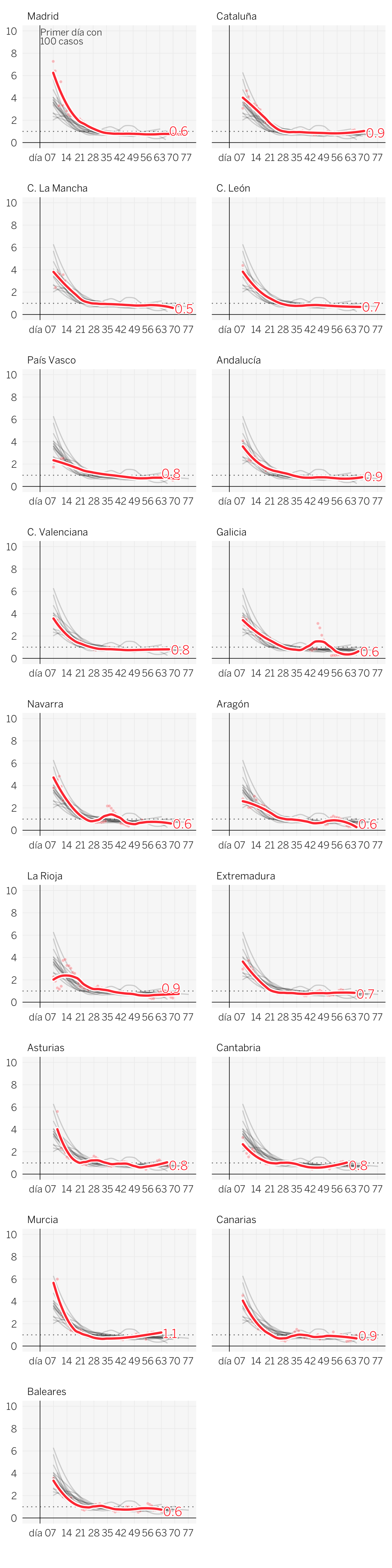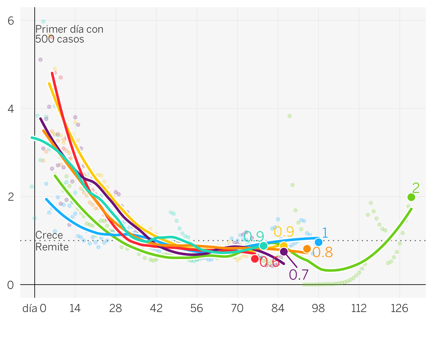 El número reproductivo mide el ritmo de contagios de la enfermedad. Cuando es mayor que 1 la epidemia crece y cuando baja de 1 comienza a remitir. Esta es su evolución en cada comunidad autónoma.