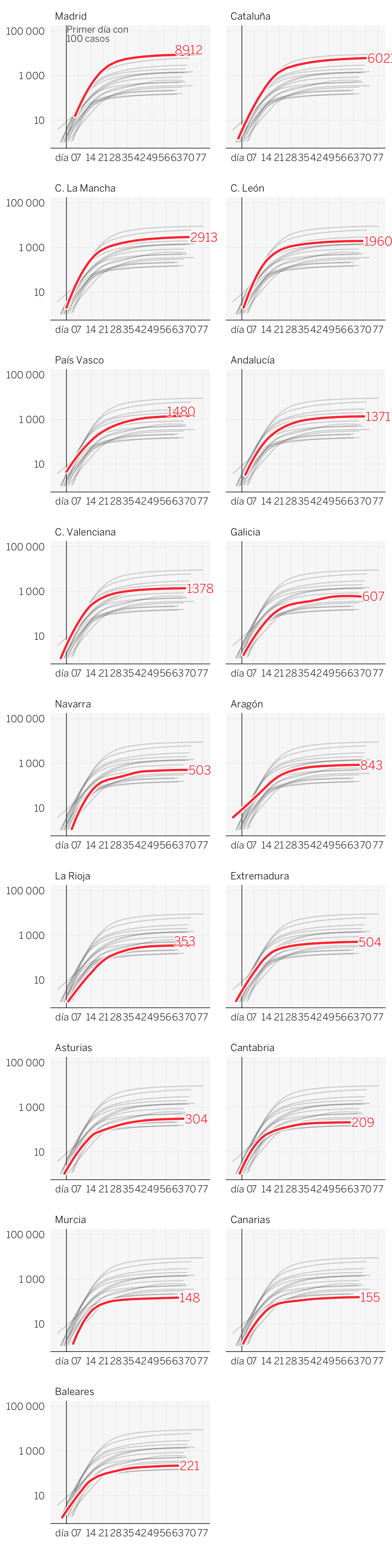 Fallecidos acumulados (en escala logarítmica) en cada comunidad autónoma y el resto.