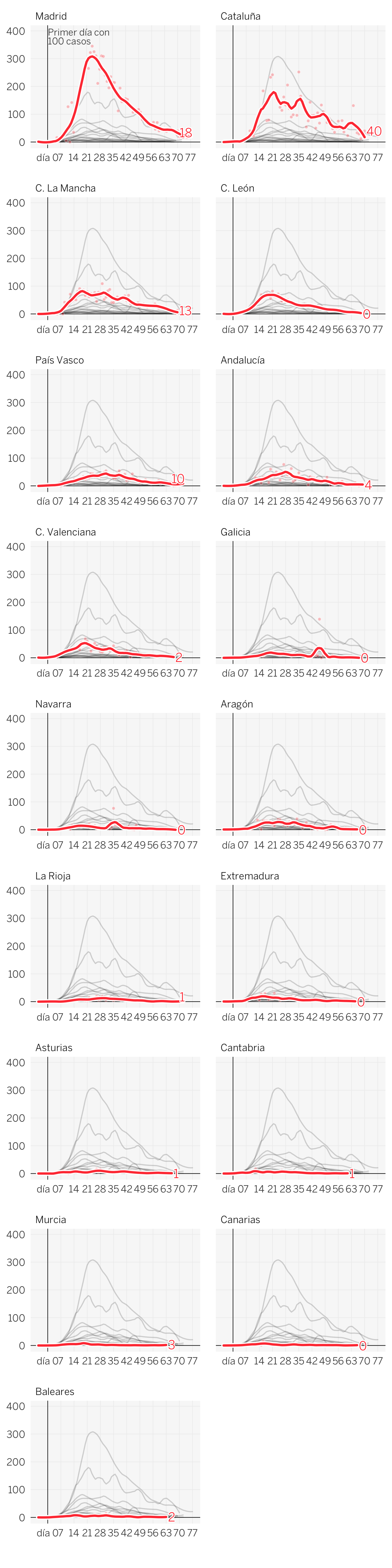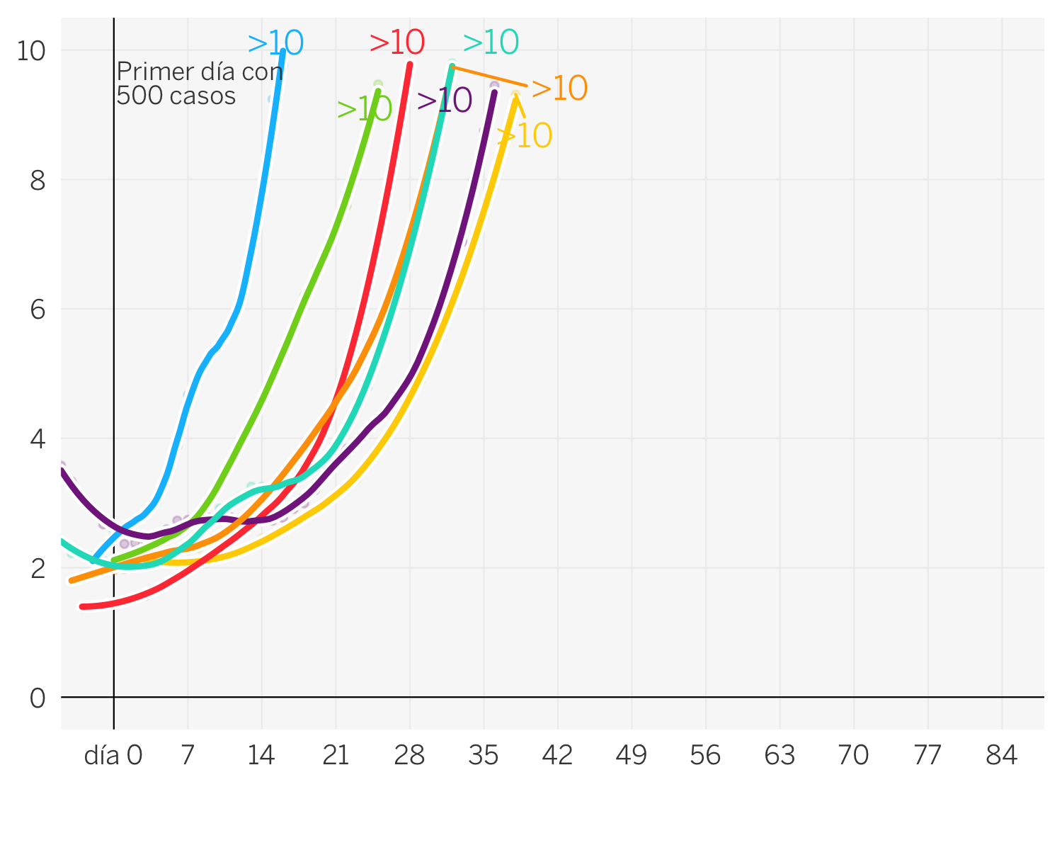 Inicio del brote. Para fijar la fecha del inicio del brote de cada país hemos tomado el día que se alcanzaron 500 casos en el país. Para los brotes de las comunidades hemos tomado el día que se superan los 100 casos.