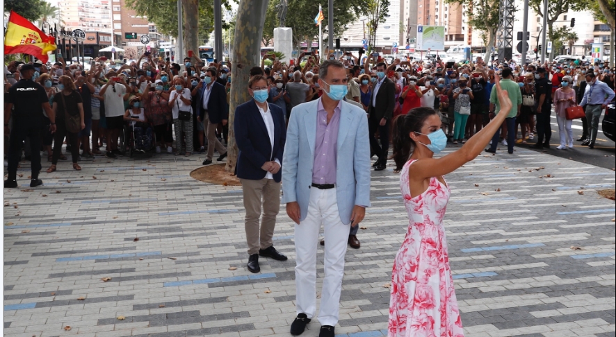 Los Reyes llegaban sobre las 11.20 a hotel donde tenían ese encuentro en su coche después de que en el último momento se descartara su llegada prevista en helicóptero al parque comarcal de Bomberos de la Marina Baixa ubicado en Benidorm. Tras esa reunión se han dirigido por la avenida de Europa a la playa de Levante. Apenas ha sido un paseo de 260 metros pero la playa estaba abarrotada de personas, tanto en la arena, en los bares, paseo o balcones, esperando que pasaran los monarcas. Doña Letizia vestida de blanco y rosa y Don Felipe con tonos claros., ambos en todo momento con mascarillas, han caminado entre la multitud bajo el sol y el calor que hacía hoy en la capital turística. En el recorrido se han oído gritos de «Viva el Rey» y vítores y aplausos acompañados de banderas de España o pancartas con «Bienvenidos a Benidorm».