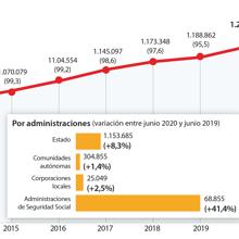 4. La deuda, un lastre para la recuperación. Las cuentas públicas se tambalean tras el estallido del coronavirus. La deuda del conjunto de las administraciones alcanzó en junio los 1.289.905 millones de euros, lo que supone 32.087 millones más que en el mes anterior y 82.473 millones más respecto a junio de 2019, según las cifras difundidas ayer por el Banco de España. Desde el mes de febrero, preludio de la pandemia, el pasivo de las administraciones se ha disparado en 88.130 millones de euros. Y ahora representa aproximadamente el 114% del PIBprevisto para el conjunto del año. La deuda pública superó el 100% del PIB a principios de 2015, un hito que no se producía desde 1909. Con el crecimiento de la economía, sin embargo, la ratio fue rebajándose, hasta alcanzar a finales de 2019 el 95,5% del PIB de España.