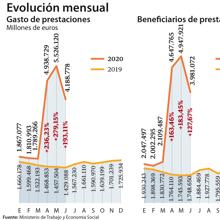 2. La factura mensual en desempleo y pensiones roza los 15.000 millones. La máquina del gasto está a tope de revoluciones. El impacto del coronavirus en el mercado laboral ha disparado el pago de prestaciones y esta tendencia se refleja con claridad en la estadística. En los primeros seis meses el desembolso en desempleo se ha disparado hasta los 20.121 millones, lo que supone un 120% más que los pagos que el SEPE realizaba en el mismo periodo del año anterior. Hoy, cuatro millones de personas reciben una ayuda, que de media es de 1.066 euros al mes, cuyo coste para las arcas públicas alcanza los 4,2 millones.