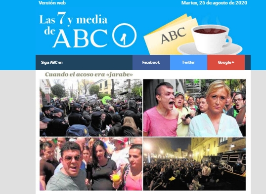 Martes, 25 de agosto de 2020   Siga ABC enFacebookTwitterGoogle +ESPAÑAREBROTES DE CORONAVIRUS«En un mes, mes y pico volverán a confinar a los mayores de todas las residencias»SOCIEDADRadiografía del enfermo de coronavirus en España: quién, cómo y cuándo se contagiaPOLÍTICAEl PSOE tiene en su mano salvar a Iglesias de comparecer por la presunta corrupciónELECCIONES EE.UU. 2020Trump asegura que si los demócratas ganan será porque «cometen fraude»ECONOMÍABruselas analizará si el rescate de Air Europa facilita su venta a IberiaDEPORTESEl Real Madrid propondrá a su plantilla otra rebaja salarial… Y LA MEDIALas 10 mejores ciudades españolas para escaparse en septiembre