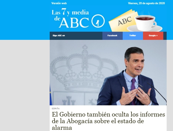 Imprimir todoABC – Las 7 y media <las730@info.abc.es>(hace 4 horas)para mí   Versión webViernes, 28 de agosto de 2020   Siga ABC enFacebookTwitterGoogle +ESPAÑAEl Gobierno también oculta los informes de la Abogacía sobre el estado de alarmaCOVID-19España cuenta con ocho de las diez regiones de la UE con más coronavirusSOCIEDADQuién, cuándo y por qué este año es más importante vacunarse de la gripeVIVIENDALa pandemia desinfla los alquileres en Madrid y BarcelonaECONOMÍASánchez trata ahora de ganarse al Ibex 35 frente a los ataques de Unidas PodemosELECCIONES EE.UU. 2020Comienza la campaña electoral: Trump acepta la nominación republicanaMOTORCuatro consejos de la DGT que evitan la mayoría de accidentes y multas… Y LA MEDIA¿Pudo la vida «emigrar» desde Marte hasta la Tierra?