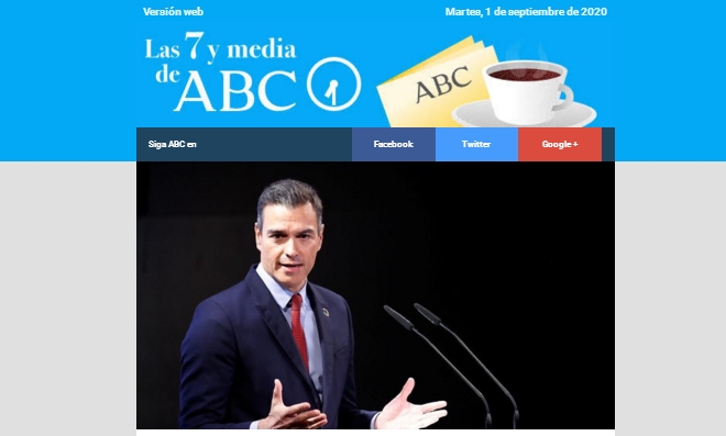 Versión webMartes, 1 de septiembre de 2020   Siga ABC enFacebookTwitterGoogle +ESPAÑASánchez presiona a Casado reclamándole «unidad» frente al virus delante del Ibex 35ECONOMÍAEl Gobierno rebaja el coste del teletrabajo para las empresas y les da más controlCASO DINALa sospecha se mantiene sobre Iglesias pese al informe de la CientíficaSOCIEDADPortugal y España, las dos caras de la moneda en los rebrotes del coronavirusINTERNACIONALMaduro indulta a 110 presos políticos, pero olvida a los más significativos de VenezuelaCIENCIARusia desclasifica imágenes inéditas de la bomba atómica más potente de la historiaHISTORIAEl lado más controvertido de Franco: falsos mitos, curiosidades y misterios sobre su vida… Y LA MEDIAGato por liebre en la gastronomía: qué sirven en lugar de auténticas zamburiñas