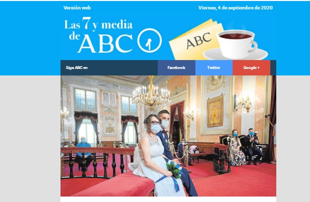 Imprimir todoEn una ventana nuevaABC – Las 7 y media    Versión webViernes, 4 de septiembre de 2020   Siga ABC enFacebookTwitterGoogle +LOCALMadrid veta las reuniones de más de 10 personas, bailes y barras libres en bodasCORONAVIRUSMedio millón de contagios en España: regreso al top mundial con los peores datos de la UESOCIEDAD¿Deben vacunarse antes los sanitarios y mayores? «No, no sería ético»ESPAÑAMartín Villa, ante la juez Servini: «No fui un ministro que rehuyese responsabilidades»BANCACaixabank y Bankia estudian su fusión con Goirigolzarri de presidenteLIGA DE LAS NACIONESEspaña saca un punto de orgulloHISTORIALas olvidadas negociaciones que pudieron poner fin a la Guerra Civil antes de 1937… Y LA MEDIACR7 y Georgina se comprometen en una controvertida fiesta