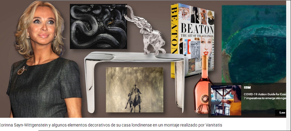 Corinna mostraba en la revista algunas estancias de su casa. como la sala de estar en la que aparece fotografiada luciendo una falda con dibujos de animales. La habitación, que cuenta con una chimenea, dos sofás y una librería, está presidida por un cuadro abstracto en tonos verdes, marrones y negros de la pintora Sandra Blow que data de 1961. Otra de las obras de arte que podemos encontrar en la residencia de la princesa es un óleo de The Bruce High Quality Foundation, una galería de arte neoyorquina. En dicho cuadro, colocado en otra de las salas de estar, aparece una recreación de la estatua ecuestre del emperador Marco Aurelio.