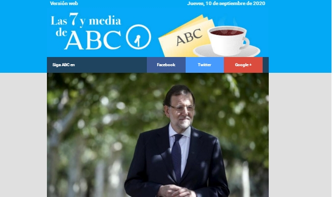 Imprimir todoABC – Las 7 y media   Versión web Jueves, 10 de septiembre de 2020   Siga ABC enFacebookTwitterGoogle +INVESTIGACIÓNAsuntos Internos señala que Rajoy tenía «conocimiento» de la Operación KitchenESPAÑALa Policía propone detener a los okupas por allanamiento y usurpación violentaSOCIEDADEspaña debería estar haciendo el doble de test para empezar a controlar la pandemiaMADRIDEl nuevo Hospital de Emergencias de Valdebebas ya está construido en un 35 por cientoECONOMÍAHacienda negocia a la desesperada para evitar que el Congreso tumbe su decretoINTERNACIONALLukashenko desarbola el comité opositor bielorruso con nuevas detencionesFÚTBOLEl virus impone una reforma a la Liga… Y LA MEDIALa Princesa elige Ciencias este curso y luego hará Sociales
