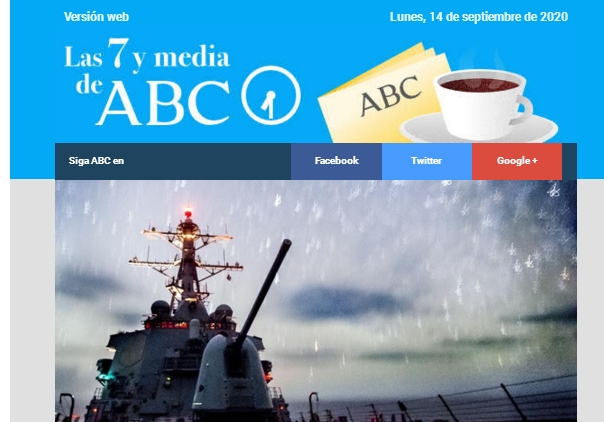 ABC – Las 7 y media Lunes, 14 de septiembre de 2020   Siga ABC enFacebookTwitterGoogle +DEFENSAEE.UU. se plantea trasladar su mando militar para África a la base de RotaSOCIEDADLa segunda vida de las escuelas rurales gracias al coronavirusCOVID-19Los visones podrían ser el vector principal de contagio del virusESPAÑAEl PP exige un protocolo para proteger a la Policía ante la inmigración irregular con CovidECONOMÍABanco Sabadell tantea una fusión con BBVA o Abanca ante la presión del BCEENTREVISTA ABCJames Story: «España debe investigar el origen de cierta financiación venezolana»FÚTBOLEl Barcelona pierde 98 millones y el Madrid gana 200.000 euros… Y LA MEDIA