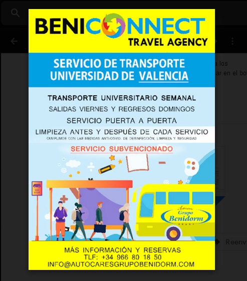 Para reservar el servicio de transporte a Valencia para universitarios o tener más información, ponersr sen contacto con Benniconnect, a través del teléfono 966 80 18 50 , info@autocaresgrupobenidorm.com o en la web www.beniconnect.com.