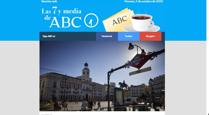 Versión webViernes, 2 de octubre de 2020   Siga ABC enFacebookTwitterGoogle +SOCIEDADEl acoso de Sanidad a Madrid lastra la economía españolaECONOMÍALos inversores extranjeros se preguntan si deben salir de MadridCOVID-19Sanidad trabaja en un semáforo que defina escenarios de incidencia en España tras tres meses de segunda olaCATALUÑAColau alimenta la impunidad penal del independentismo más violentoOPINIÓN DE CARLOS HERRERALa tormenta perfectaESPAÑAEl juez investiga si el marido de Cospedal recibió «chivatazos» de VillarejoDEPORTESEl «pensamiento único» somete al deporte… Y LA MEDIAPuñaladas en la República: el olvidado plan comunista para destruir a Indalecio Prieto