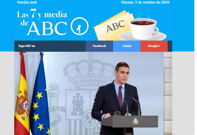 Versión webViernes, 9 de octubre de 2020   Siga ABC enFacebookTwitterGoogle +ESPAÑATRIBUNALESLos jueces noquearon a Illa por imponer una alarma encubierta en MadridMADRIDAyuso gana fuerza ante Moncloa y Aguado pese al volantazo de SánchezSOCIEDADEl Comité de Bioética rechaza la eutanasia como derecho y prestación sanitariaECONOMÍACalviño ignoró a su consejo asesor en el diseño del plan de recuperaciónJUSTICIAEl fiscal Navajas, número dos de Delgado, llevará el caso Dina en el SupremoGENTEEl mal de amores de Vanesa Romero: rompe con su novio después de cinco años