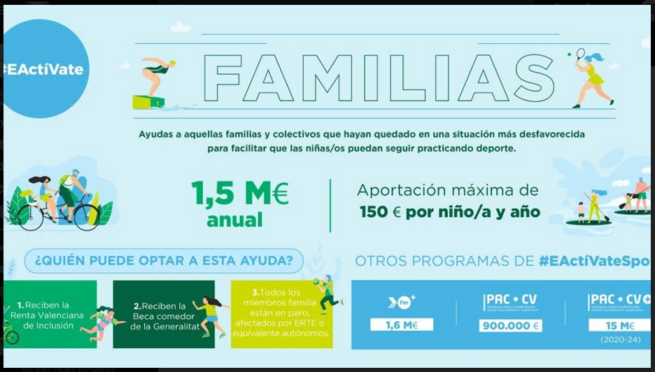Con esta iniciativa “Actívate Familias” la Fundación Trinidad Alfonso persigue reactivar el deporte base en la Comunitat Valenciana, y para ello, ayudará directamente a las familias afectadas por la crisis económica provocada por el coronavirus, a través del programa Actívate Familias. En este programa participarán las familias que tengan menores inscritos en alguna de las 34 federaciones autonómicas vinculadas a los proyectos de la Fundación Trinidad Alfonso (FER Futur, selecciones autonómicas o Esport a l’Escola +1h).