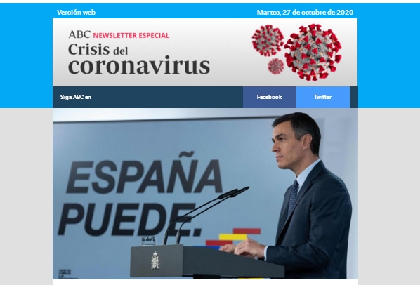 ABC – Coronavirus    Versión webMartes, 27 de octubre de 2020   Siga ABC enFacebookTwitterESPANAEl Gobierno hace voluntaria la imposición del toque de queda a partir del 9 de noviembreESPANASánchez huye del debate para prorrogar el estado de alarma y delega en IllaESPANALos juristas avisan: delegar la alarma en 16 comunidades es contrario a la leySOCIEDADSanidad notifica 18.418 nuevos contagios y más de 2.000 ingresos hospitalarios en un solo díaECONOMIALa tasa de paro escala hasta el 16,26% tras sumar 355.000 desempleados en el tercer trimestreECONOMIAAgujero de más de 11.000 millones de euros en el SEPE por la escalada del paroESPANAAguado pide el cierre perimetralmente Madrid el puente y Ayuso lo decidirá entre hoy y mañanaESPANACataluña sopesa un confinamiento total de 15 días para evitar su colapsoSOCIEDADLa UE advierte que no habrá sufientes vacunas para todos los europeos hasta 2022