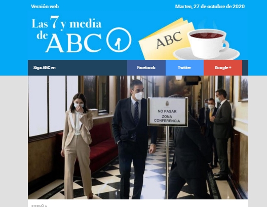 Imprimir todoABC – Las 7 y media  Versión webMartes, 27 de octubre de 2020   Siga ABC enFacebookTwitterGoogle +ESPAÑALos juristas avisan: delegar la alarma en 16 comunidades es contrario a la leyPOLÉMICALa amistad de Delgado y Garzón ensombrece los nombramientos en el Consejo FiscalECONOMÍAPSOE y Podemos cierran un acuerdo sobre alquileres y el IMV para poder presentar el Presupuesto este martesINTERNACIONALLeopoldo López: viaje de Caracas a Madrid en coche, barco y avión, vía Miami, con identidad falsaEDUCACIÓNLa concertada se echa por primera vez a la calle para detener la «ley Celaá»POLÍTICAVox ingresó 1 millón más que el PP por afiliados el año pasadoCIENCIASorpresas al estudiar la atmósfera de un planeta que no debería existir