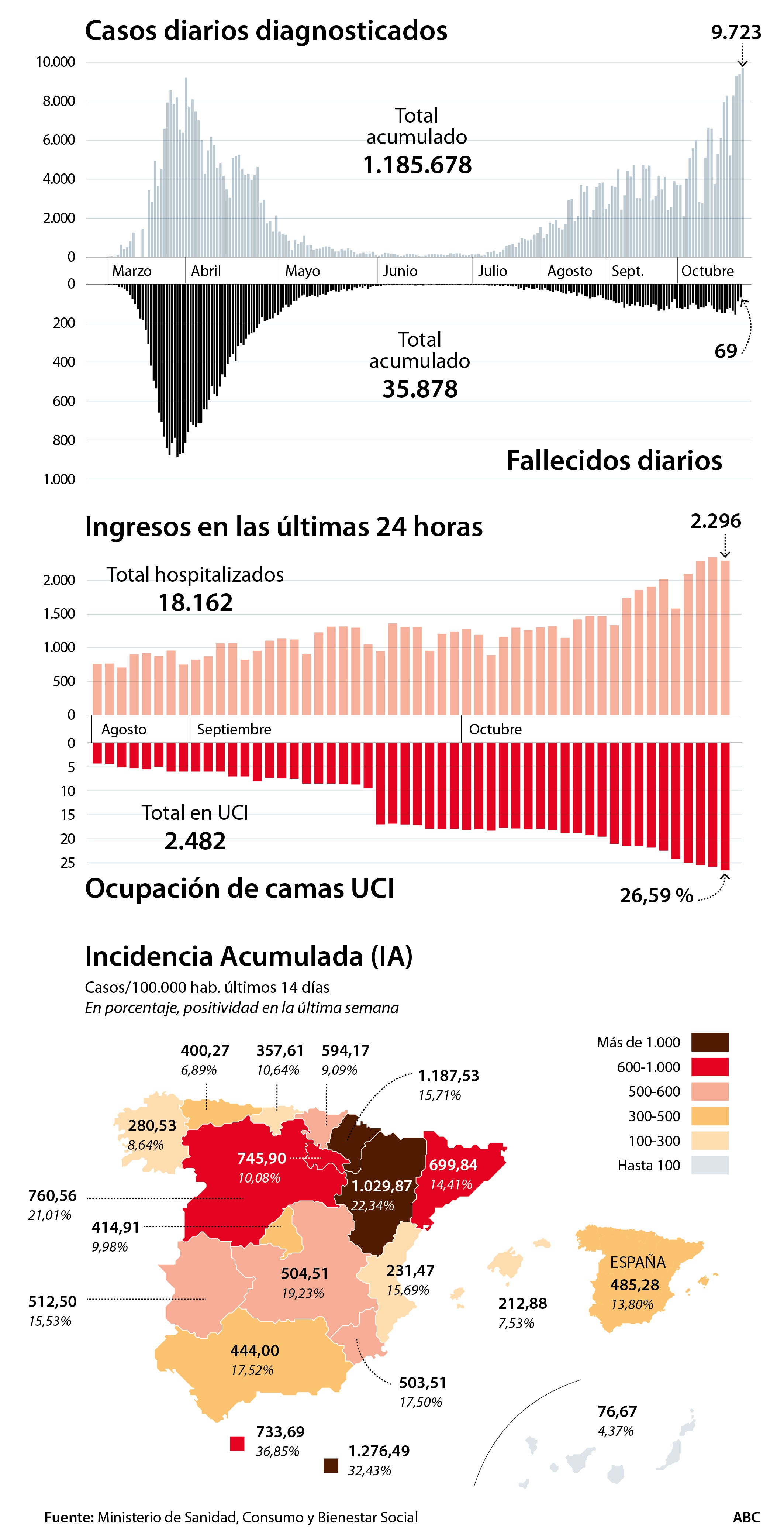 La cifra global de contagios en España se eleva ya a 1.185.678 desde el inicio de la pandemia, según las estadísticas oficiales. La incidencia acumulada en los últimos 14 días se sitúa en 485, frente a los 468 de ayer y los 361 del viernes pasado, con un total de 228.208 positivos en las pasadas dos semanas.