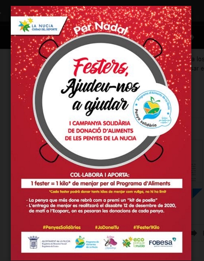 Este sábado finaliza la “I Campanya Solidària de Donació d’Aliments de les Penyes de La Nucia”. Esta iniciativa trata de involucrar a los “festers i festeres” en la recogida de alimentos con fines solidarios. Bajo el lema “Festers, ajudeu-nos a ajudar” se pretende implicar a las penyas en la recogida de alimentos no perecederos en estas fechas pre-navideñas, para su reparto posterior a las familias con menos recursos de La Nucía a través del “Programa de Alimentos”. La entrega se realizará este sábado 12 de diciembre por la mañana en el Ecoparque de La Nucía, en el que se pesará la donación que cada penya realice.
