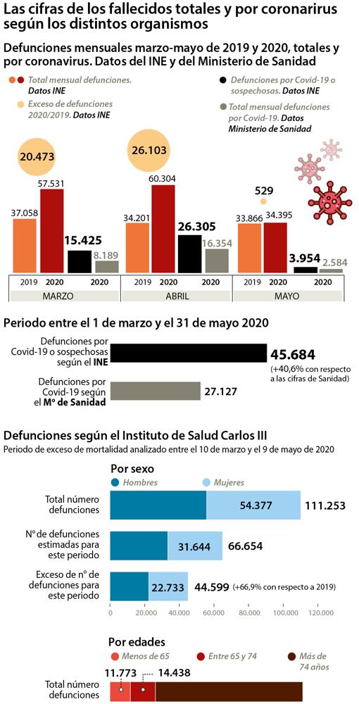 El exceso de mortalidad durante los meses de marzo, abril y mayo respecto al año anterior fue de 47.105 fallecimientos. El número total de defunciones por Covid-19 identificado representó el 69,3 por ciento de ese exceso de mortalidad. Los fallecimientos por Covid-19 sospechoso representaron el 27,7 por ciento. El 3 por ciento restante se atribuye a otro tipo de causas.