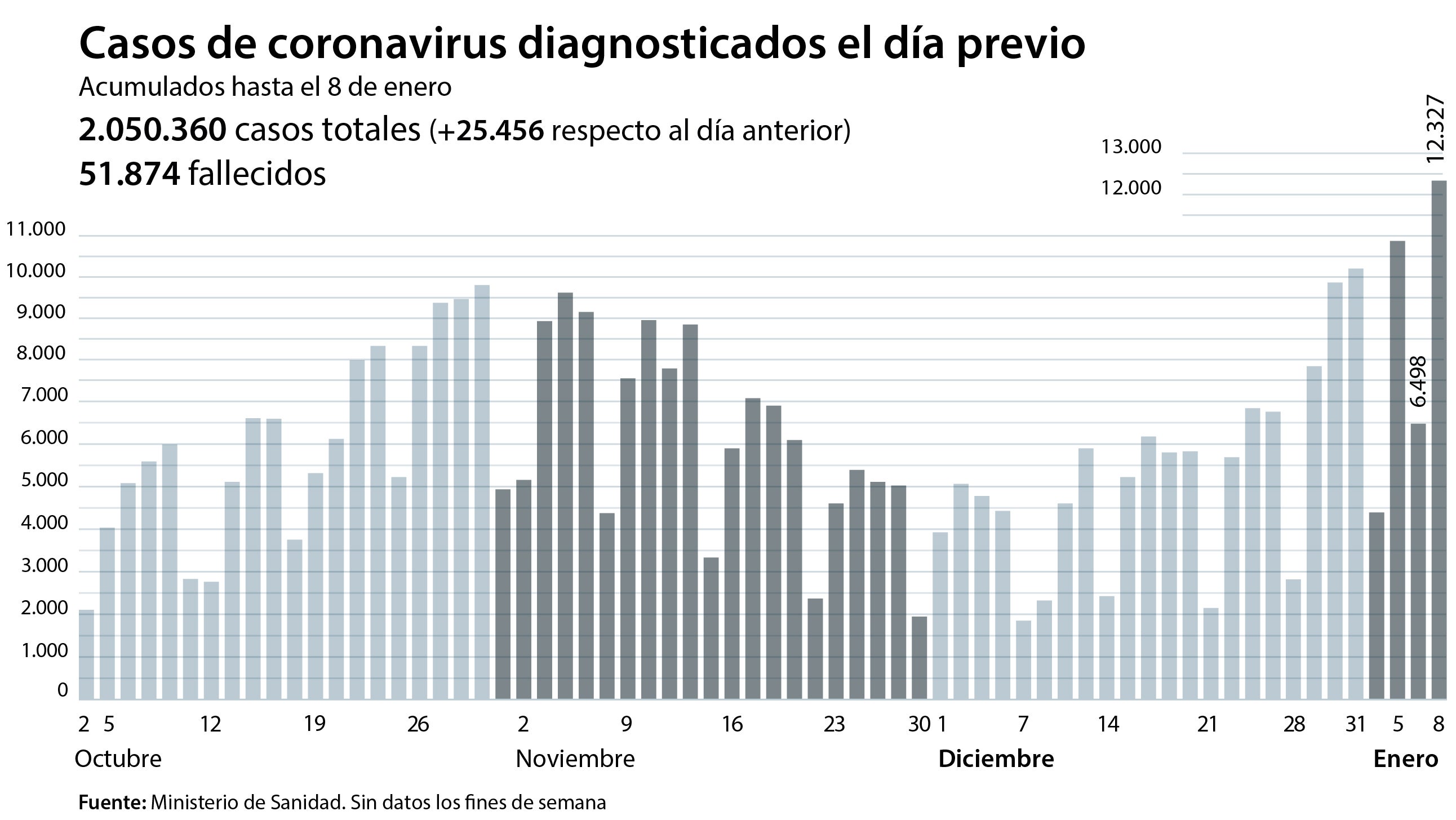 El número de casos de coronavirus asciende en España a 2.050.360 y en las últimas 24 horas se han registrado 25.456 casos y 199 fallecimientos