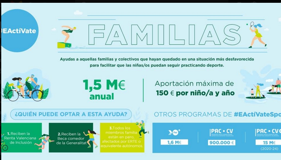 Se trata de una ayuda directa a la familia del niño deportista, para que pueda seguir practicando deporte. Pueden optar a este programa los deportistas menores de edad que pertenezcan a una familia que cumpla con al menos uno de los siguientes requisitos: Reciba la Renta Valenciana de Inclusión; Reciban la beca comedor de la Generalitat o Padre y madre (ambos), o uno de ellos (en caso de familia monoparental) están en paro o afectados por ERTE. Este programa “Actívate Familias” la Fundación Trinidad Alfonso se ha dotado con 1,5 millones de euros.