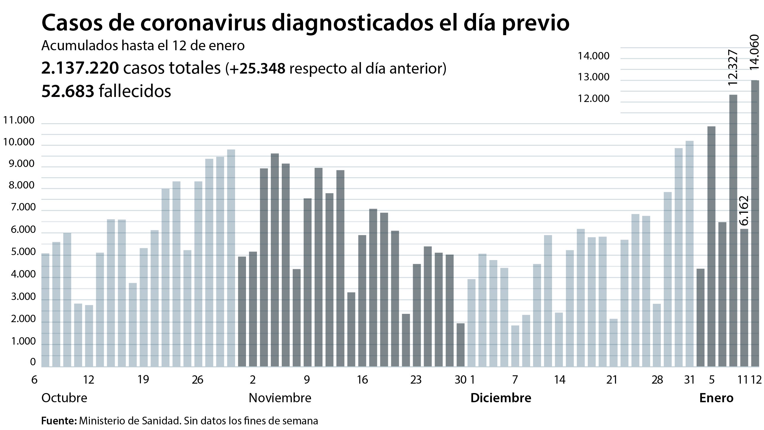 Los contagios llevan aparejados, además, un alarmante aumento en el número de fallecidos. Se han notificado 408 muertos más por Covid-19, lo que sitúa la cifra global en 52.683 muertos. Hace siete días, el martes 5 de enero, cuando ya se podían notar los primeros efectos de los festivos navideños, el número de fallecidos fue de 352 personas.