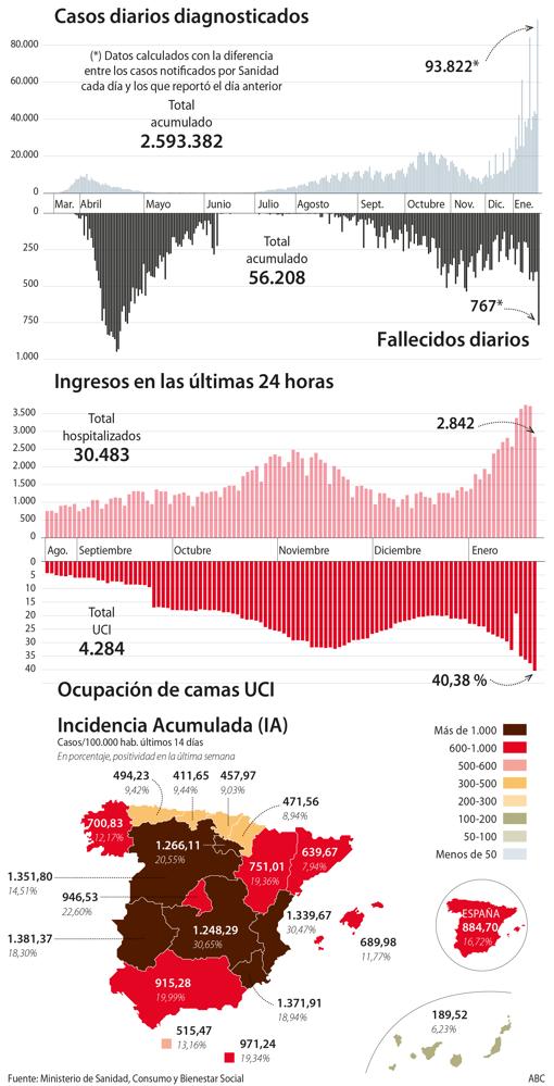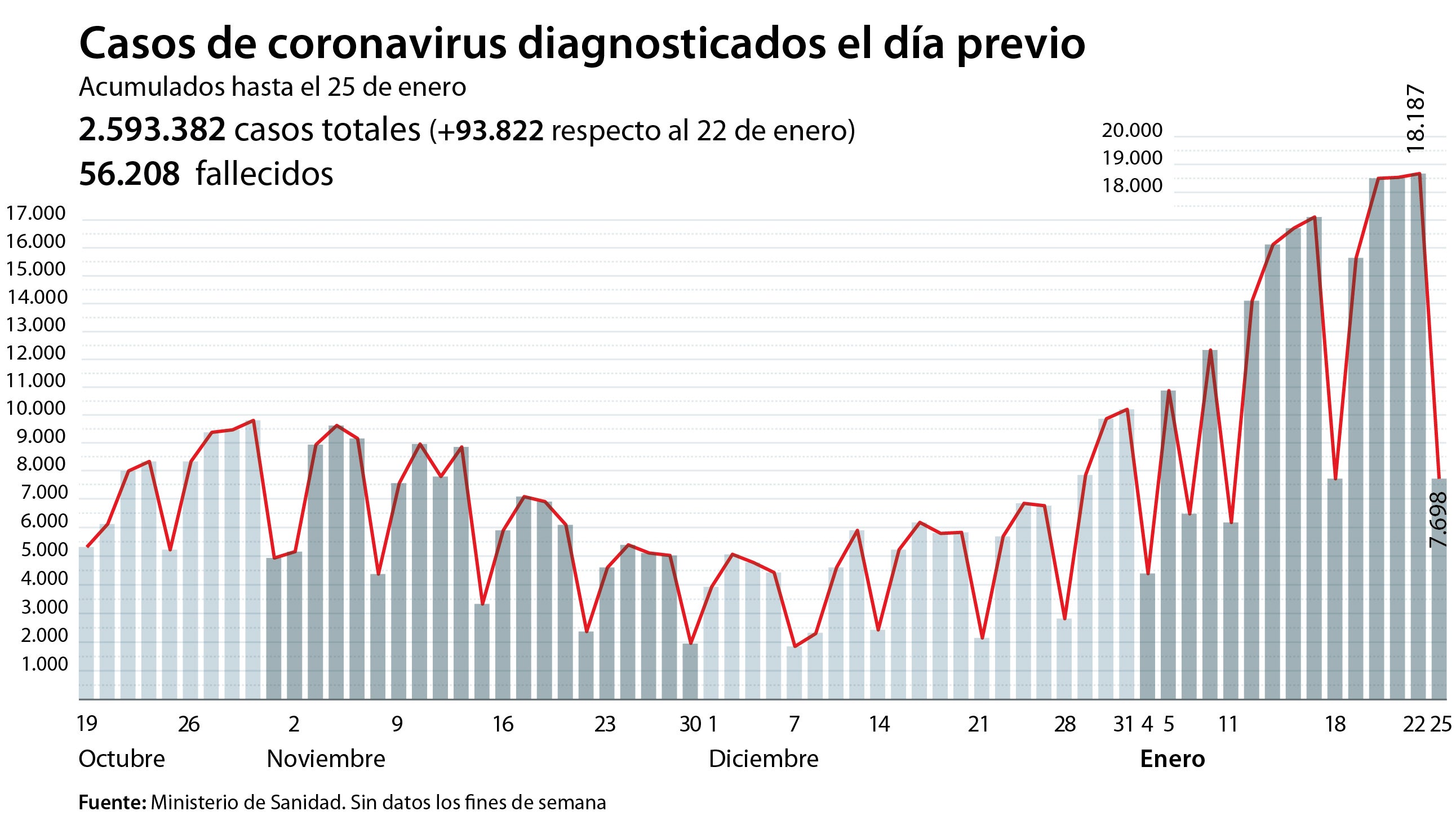 El Ministerio de Sanidad ha notificado este lunes 93.822 contagios, el peor fin de semana desde que comenzó la pandemia de coronavirus en España. Del total de nuevos casos, 7.698 se diagnosticaron el día previo, es decir, este domingo. Desde el principio de la crisis sanitaria se han infectado 2.593.382 personas.