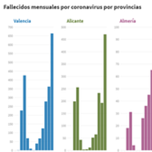 2. Cinco provincias registran en enero el mayor número de fallecidos por coronavirus de toda la pandemia. La tercera ola de coronavirus está siendo especialmente cruenta en cinco provincias españolas que, a falta de que concluya enero, lo sitúan ya como el mescon más muertes de toda la pandemia. Así, tal y como se observa en el gráfico superior, elaborado con datos del Centro Nacional de Epidemiología, las provincias de Alicante, Almería, Badajoz, Cádiz y Valencia están afrontando ahora sus peores momentos. En términos absolutos, Valencia, con 663 muertos a causa del coronavirus, se sitúa además como la provincia que registra más fallecidos en toda España en este periodo. Para hacernos una idea de lo que está suponiendo esta tercera ola en la provincia basta con recurrir al dato de abril, el segundo mes con más pérdidas a causa de la enfermedad, momento en el que se registraron 425 muertes.