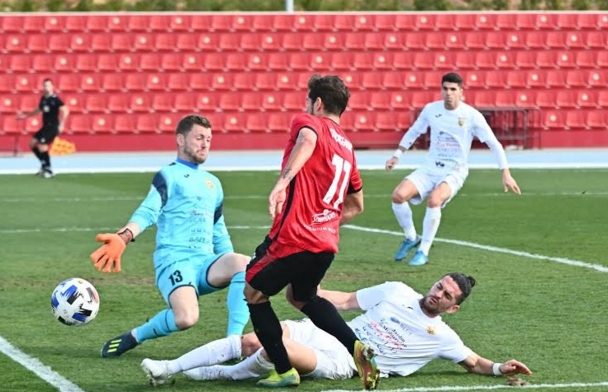El partido del miércoles Orihuela lastró a los nucieros, que les costó seguir con el ritmo de juego de los últimos encuentros y sufrió en los primeros compases del partido. Sin embargo, a los 15 minutos el colegiado señalaba penalti a favor de La Nucía, tras unas manos en el área visitante. Agüero, que había anotado los dos últimos partidos desde los 11 metros, no acertaba y mandaba fuera el penalti, ante la desesperación del banquillo nuciero. Lejos de venirse abajo los rojillos siguieron apretando y Morgado, tres minutos después, realizaba una magnífica diagonal y remataba cruzado topándose con un inspirado Seral. A la media hora de juego, a punto estaría de nuevo el delantero nuciero, tras un gran balón a la espalda de Miñano, pero el control le hizo escorarse demasiado. Los nucieros lo intentaron a balón parado, peros les costó acertar en el remate. De nuevo Morgado, en los instantes finales del primer tiempo, a punto estaría de colocar el primero de la mañana tras una buena dejada de tacón de Pina, pero su disparo se estrellaba en la defensa visitante. Con las tablas en el marcador se llegó al descanso, 0-0.