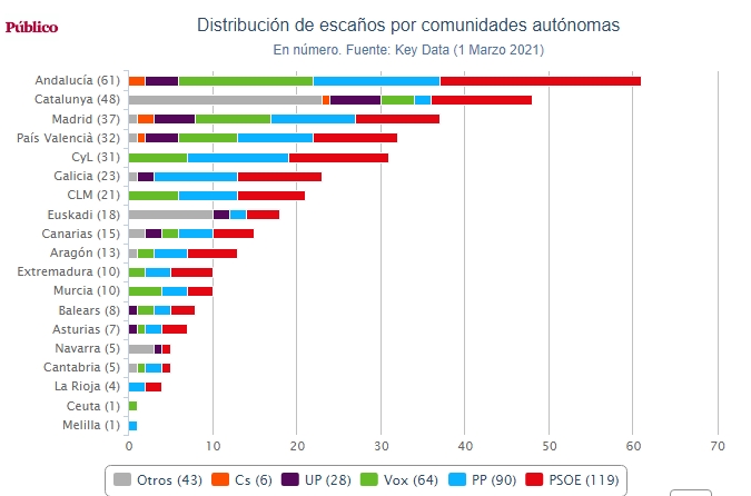 Por comunidades autónomas, el PSOE perdería un escaño en Castilla-La Mancha y Andalucia, mientras que ganaría uno en Balears. El PP perdería uno en Castilla y León y ganaría dos (uno en Euskadi y otro en la Comunitat Valenciana). Vox no perdería escaños, y ganaría cuatro en Andalucía, dos en Catalunya y otros dos en Madrid, y uno en Castilla-La Mancha, Murcia, Castilla y León y Aragón. Unidas Podemos perdería dos en Andalucía y uno en Catalunya, Euskadi, Balears, Murcia y Aragón. Ciudadanos perdería uno en Catalunya, Madrid, Comunitat Valenciana y Andalucía.