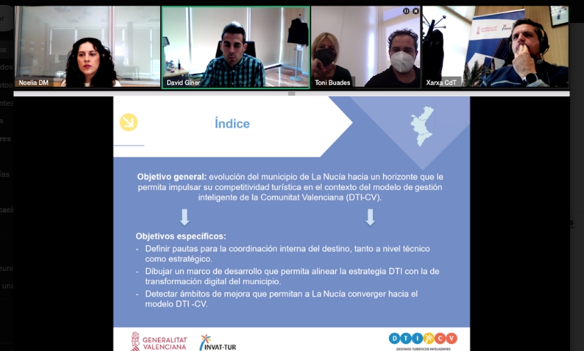 En esta sesión de análisis del “Informe del proyecto de Destino Turístico-Deportivo Inteligente de La Nucía” participaron telemáticamente Francisco Juan, director de Invattur, David Giner, Director de Proyectos de Invattur, Noelia Delgado, técnica del Invattur, Toni Buades, coordinador del proyecto DTI-DDI La Nucía y Mª Jesús Jumilla, concejala de Turismo.