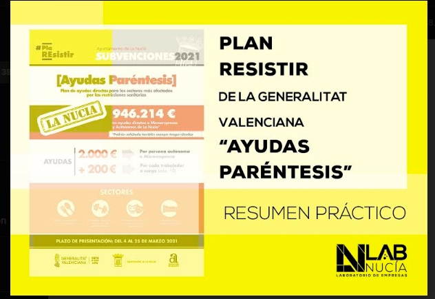 Hasta el 25 marzo se podrán solicitar en La Nucía las “Ayudas Paréntesis” del Plan Resistir. A ellas podrán acogerse autónomos y micro empresas nucieras de los sectores productivos de Restauración, Hostelería, Actividades Deportivas y recreativas… etc.