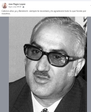 Aqui no se me permitio hacer monolito del referido creador de Benidorm. El 4 de enero de 2017 escibia una carta al alcalde, REGISTRADA, en la que le pedia autorización para ello-¡Es mas!, le señalaba el lugar donde se debería situarse, concretamente en la Plaza Triangular. Nuestra primera autoridad siempre hizo oídos sordos a este requerimiento y nunca respondió, no solo a la que inicie el deseo, la fecha que hoy doy, sino de otras que le seguir enviando.