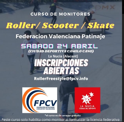 Este sábado 24 de abril en la Ciutat Esportiva de La Nucía se desarrollará un Curso gratuito de Monitor de Scooter-Roller-Skate de la Federación de Patinaje de la Comunitat Valenciana. Todas las personas interesadas en esta formación deben inscribirse en rollerfreestyle@fpcv.info. Los únicos requisitos para participar en el curso es ser mayor de 16 años y tener conocimiento previo de alguna de las tres modalidades: Scooter-Roller-Skate.