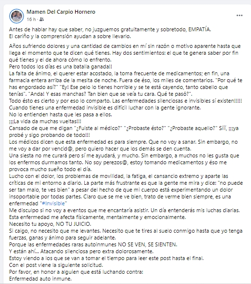 Redes.- MAMEN DEL CARPIO NOS HABLA DE SU ENFERMEDAD